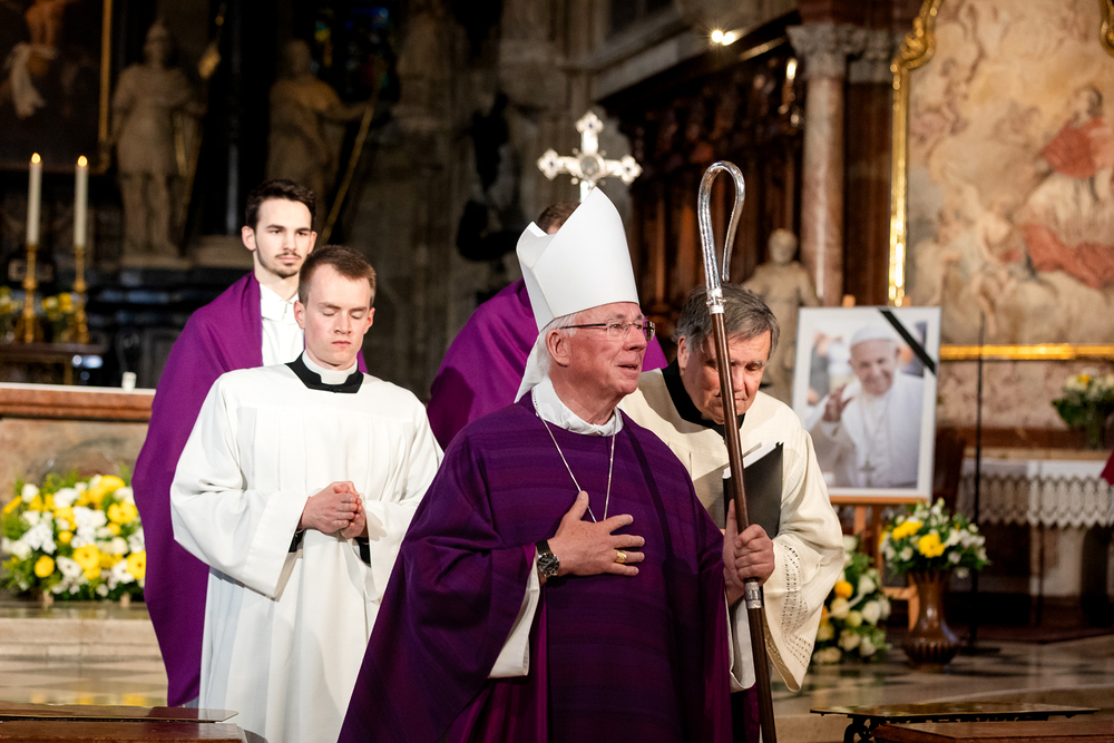 Mit einem "Requiem für seine Heiligkeit Papst Franziskus" nahm Österreich am Montagabend offiziell Abschied vom Papst. Dem Gottesdienst stand der Vorsitzende der Österreichischen Bischofskonferenz, Erzbischof Franz Lackner vor. Mit ihm konzelebrierten die heimischen Bischöfe. Die Politik war an erster Stelle von Bundespräsident Alexander Van der Bellen und Bundeskanzler Christian Stocker vertreten. Zahlreiche Gläubige gaben dem Papst im vollen Dom ebenfalls die letzte Ehre